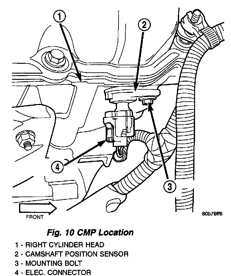 The Camshaft Position Sensor (CMP) on this engine is bolted to the front/top of the right cylinder head.