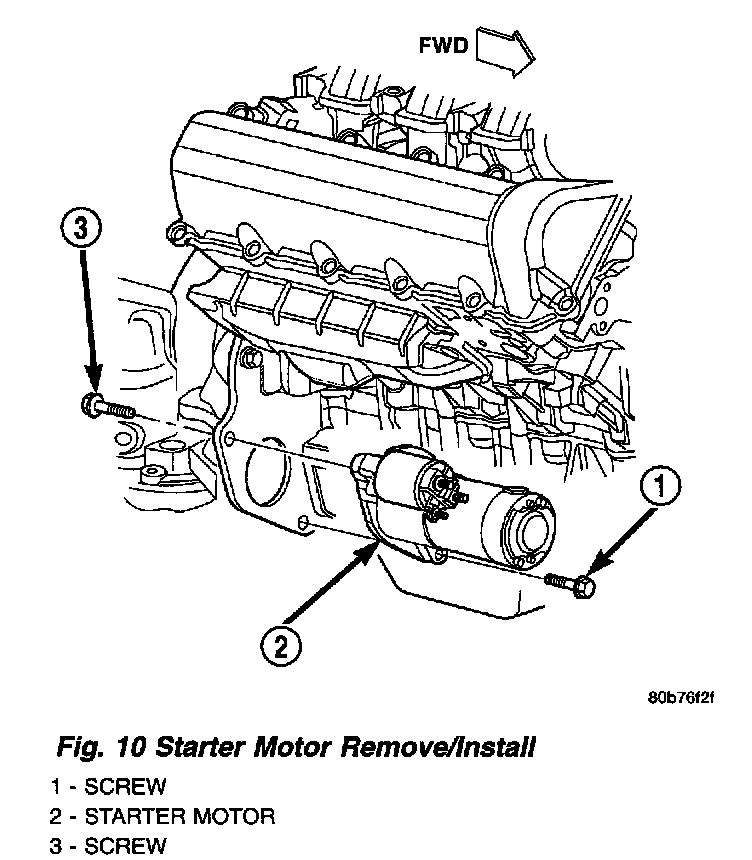 3. Remove the lower (forward facing) mounting screw securing the starter motor to the automatic transmission torque converter housing (Fig. 10).