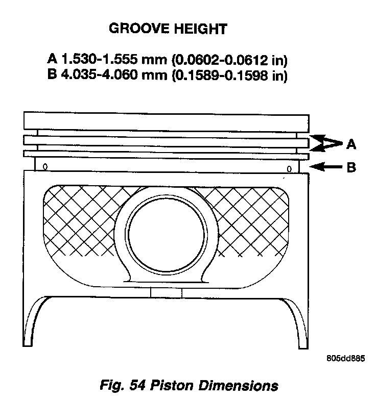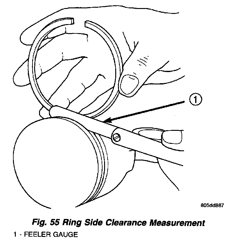 3. Measure the ring side clearance with a feeler gauge fitted snugly between the ring land and ring (Fig. 54) (Fig. 55). Rotate the ring in the groove. It must move freely around circumference of the groove.