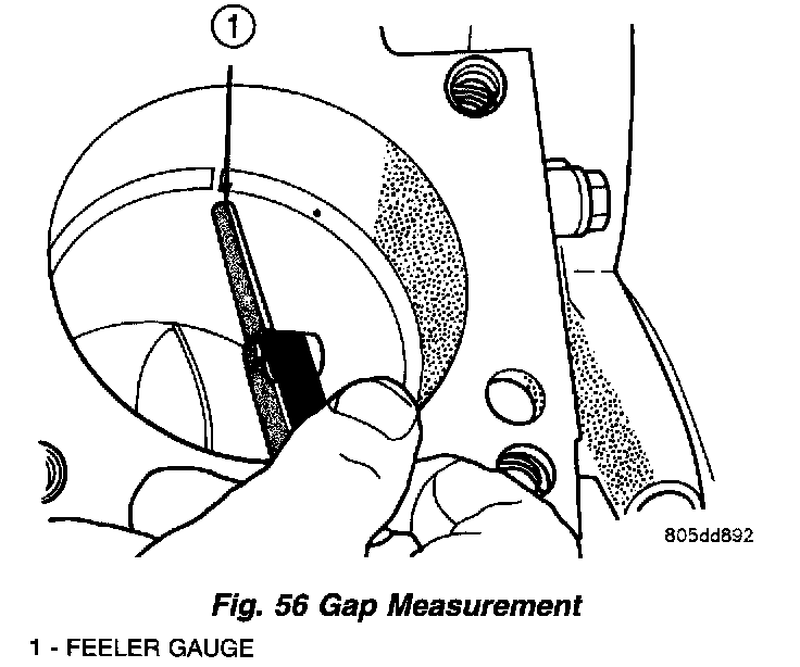 4. Place ring in the cylinder bore and push down with inverted piston to position near lower end of the ring travel. Measure ring gap with a feeler gauge fitting snugly between ring ends (Fig. 56).