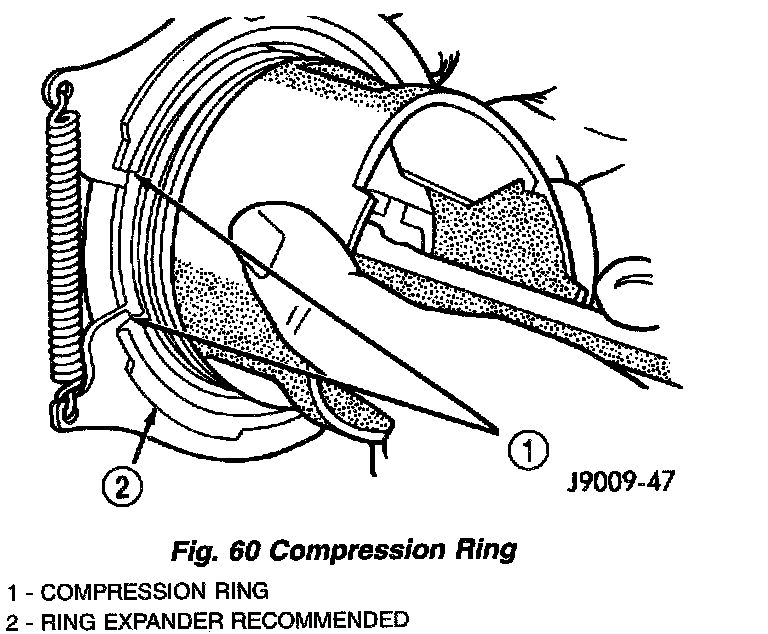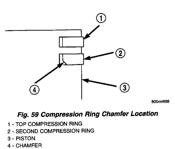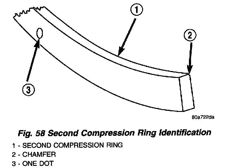 7. The second compression ring has a slight chamfer on the bottom of the inside edge and a dot on the top for correct installation (Fig. 59).