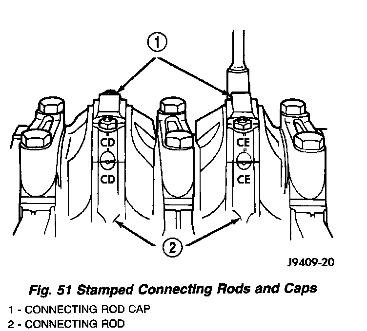 9. Remove the connecting rod bearing caps and inserts. Mark the caps and rods with the cylinder bore location. The connecting rods and caps are stamped with a two letter combination (Fig. 51).
