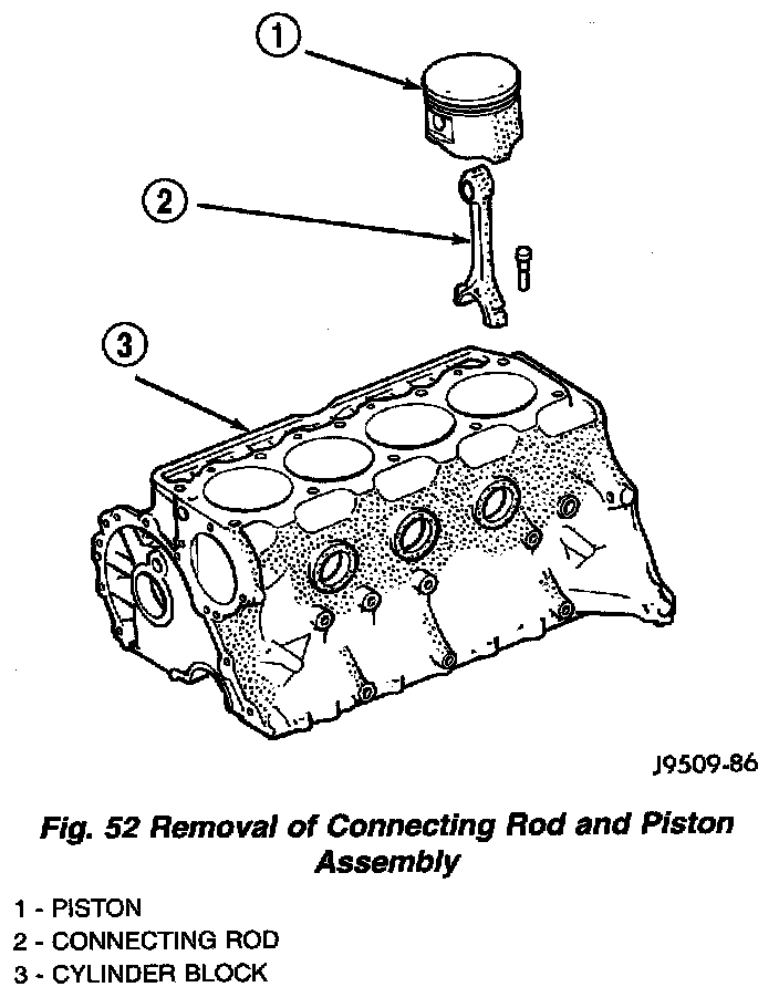 11. Have an assistant push the piston and connecting rod assemblies up and through the top of the cylinder bores (Fig. 52).