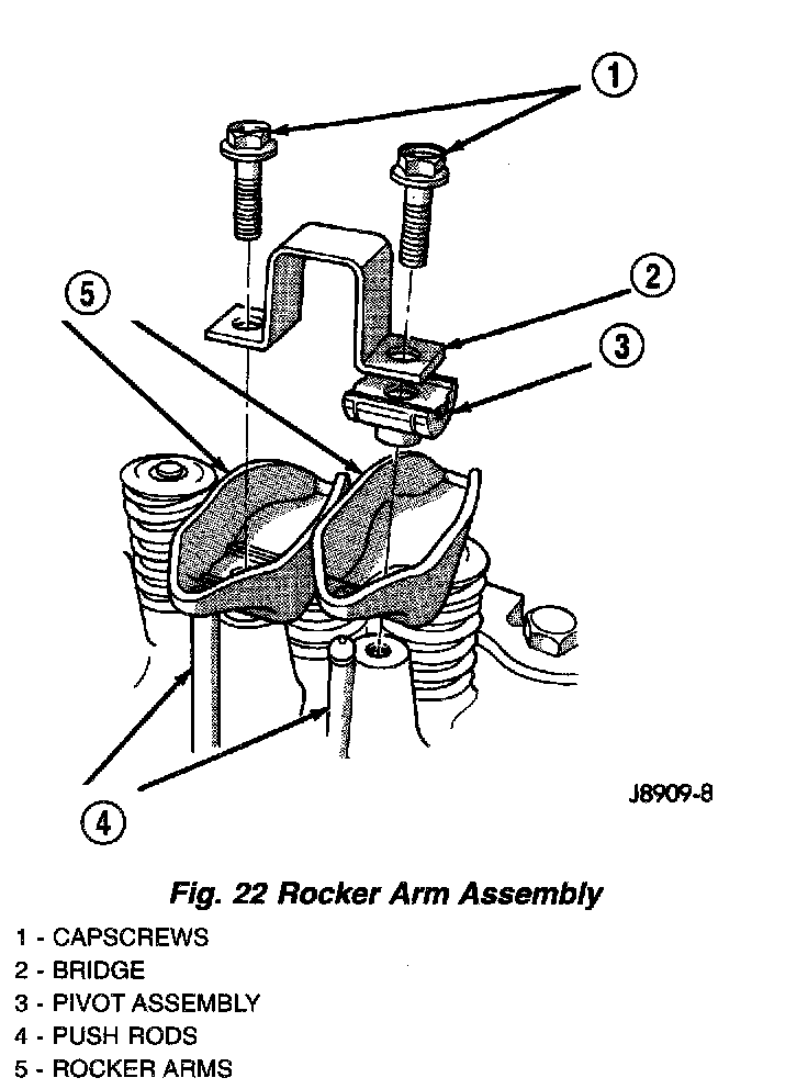 3. Remove the capscrews at each bridge and pivot assembly (Fig. 22). Alternately loosen the capscrews one turn at a time to avoid damaging the bridges.