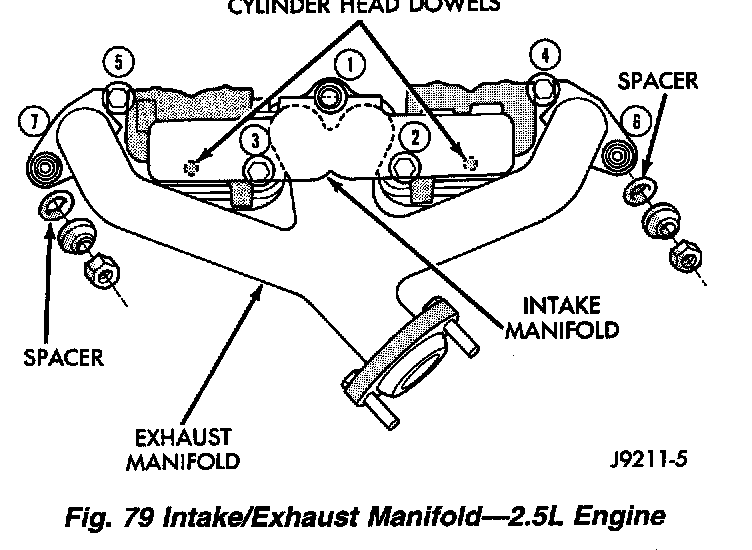 16. Remove bolts 2 through 5 securing the intake manifold to the cylinder head (Fig. 79). LOOSEN BUT DO NOT REMOVE exhaust manifold bolt No. 1 and nuts 6 and 7.