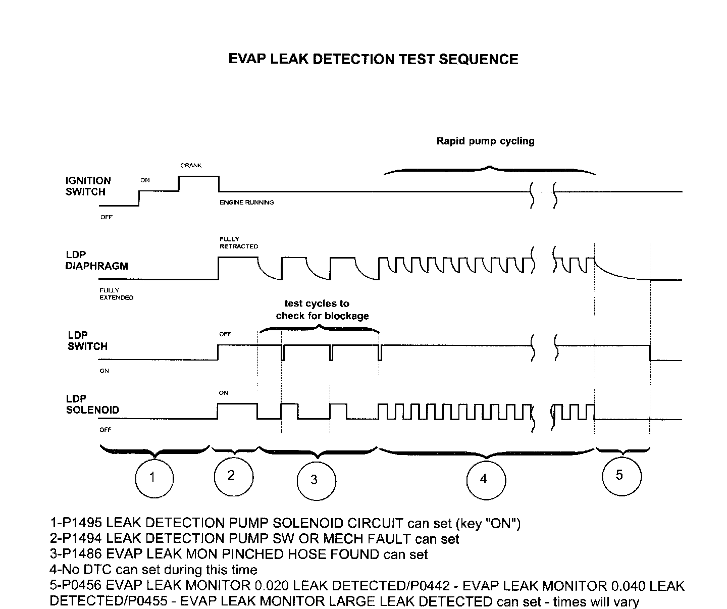 However, if the LDP reed switch closes quickly, there may be a leak or the fuel level may be low enough that the LDP must pump more to finish pressurizing the EVAP system. In this case, the PCM will rapidly pump the LDP again to build pressure in the EVAP system, and follow that by monitoring the time needed for several LDP test cycles. This process of rapid pumping followed by several LDP test cycles may repeat several times before the PCM judges that a leak is present.