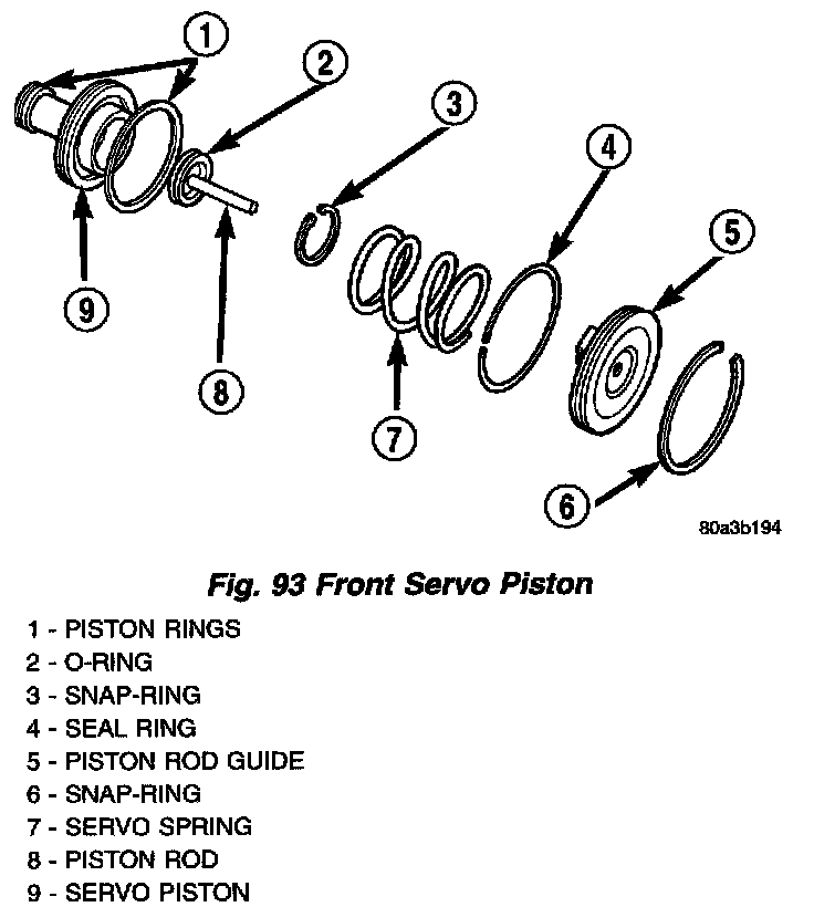 Inspect the servo components (Fig. 93). Replace the springs if collapsed, distorted or broken. Replace the guide, rod and piston if cracked, bent, or worn. Discard the servo snap-ring if distorted or warped.
