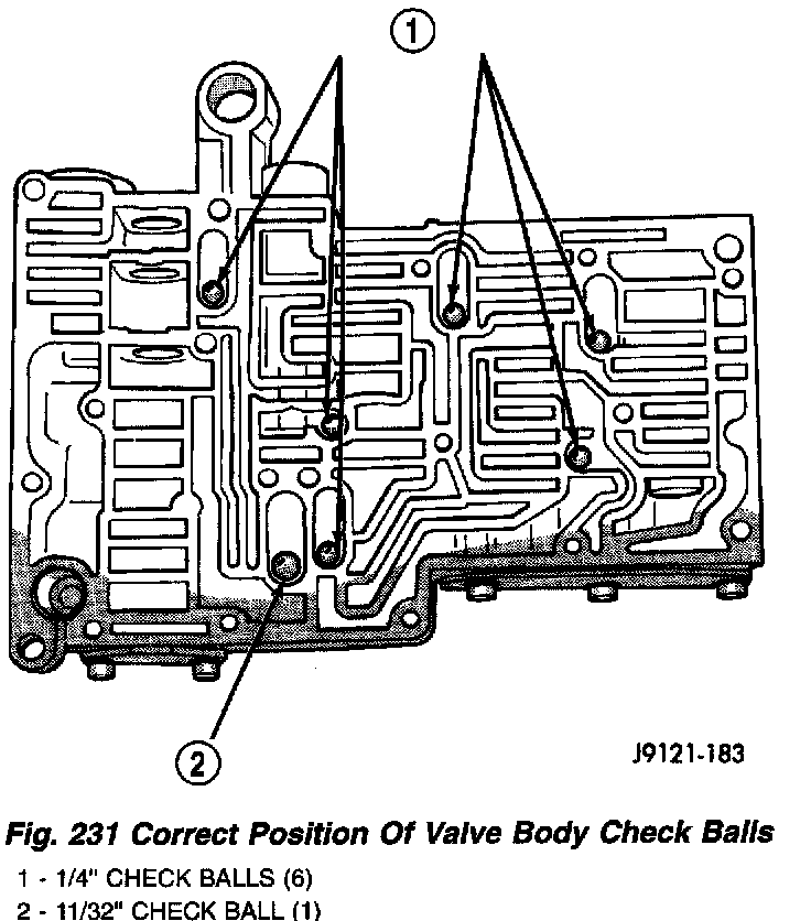 25. Place one 11/32 inch check ball and six 1/4 inch check balls in the proper cavities in the valve body (Fig. 231).