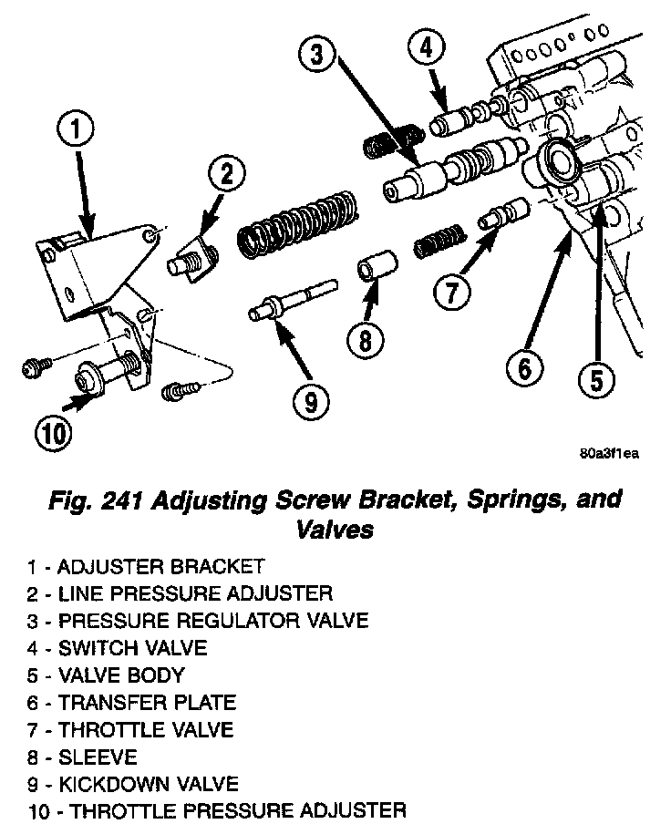 45. Install switch valve and spring, pressure regulator valve and spring, kickdown valve and spring, and throttle valve into valve body (Fig. 241).