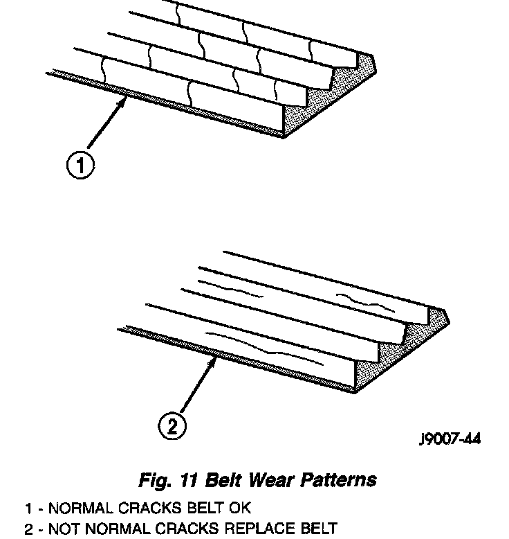 These are not a reason to replace the belt. However, cracks running along a rib (not across) are not normal. Any belt with cracks running along a rib must be replaced (Fig. 11). Also replace the belt if it has excessive wear, frayed cords or severe glazing.