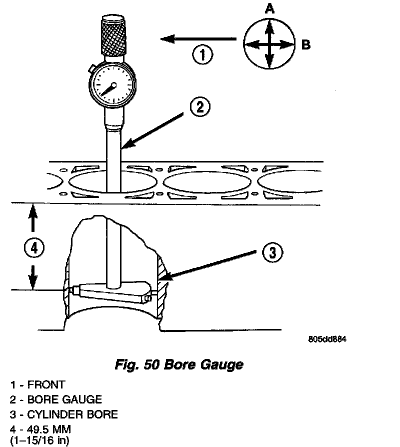 2. Measure the inside diameter of the cylinder bore at a point 49.5 mm (1-15/16 inches) below top of bore. Start perpendicular (across or at 90 degrees) to the axis of the crankshaft at point A and then take an additional bore reading 90 degrees to that at point B (Fig. 50).
