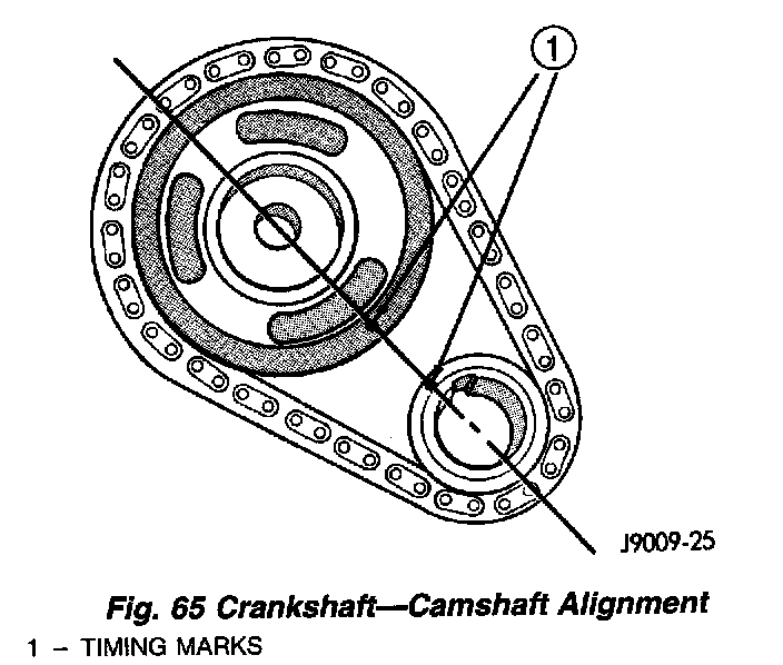 6. Rotate crankshaft until the "O" timing mark is closest to and on the center line with camshaft sprocket timing mark (Fig. 65).