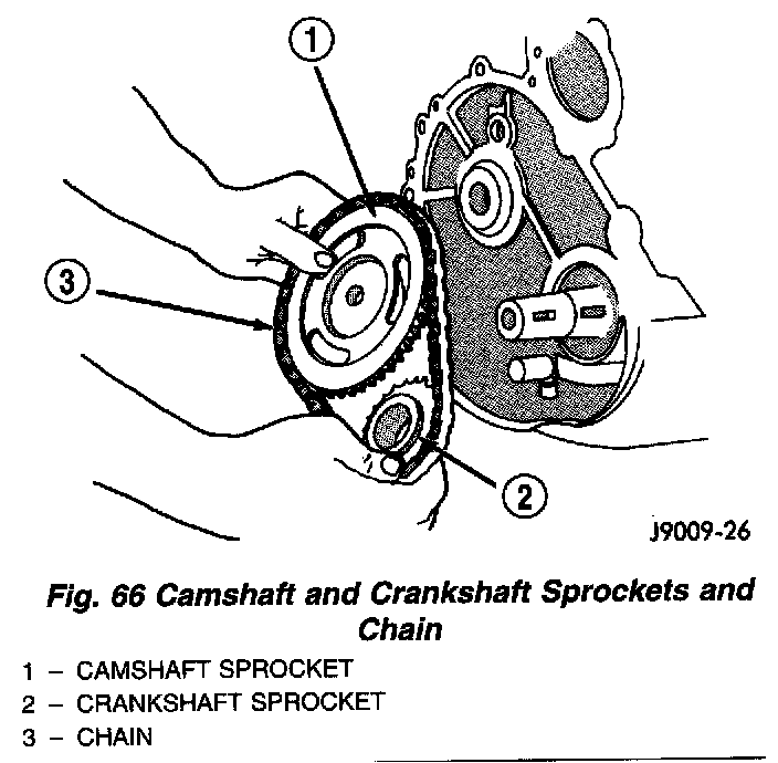 8. Remove the camshaft retaining bolt and remove the sprockets and chain as an assembly (Fig. 66).