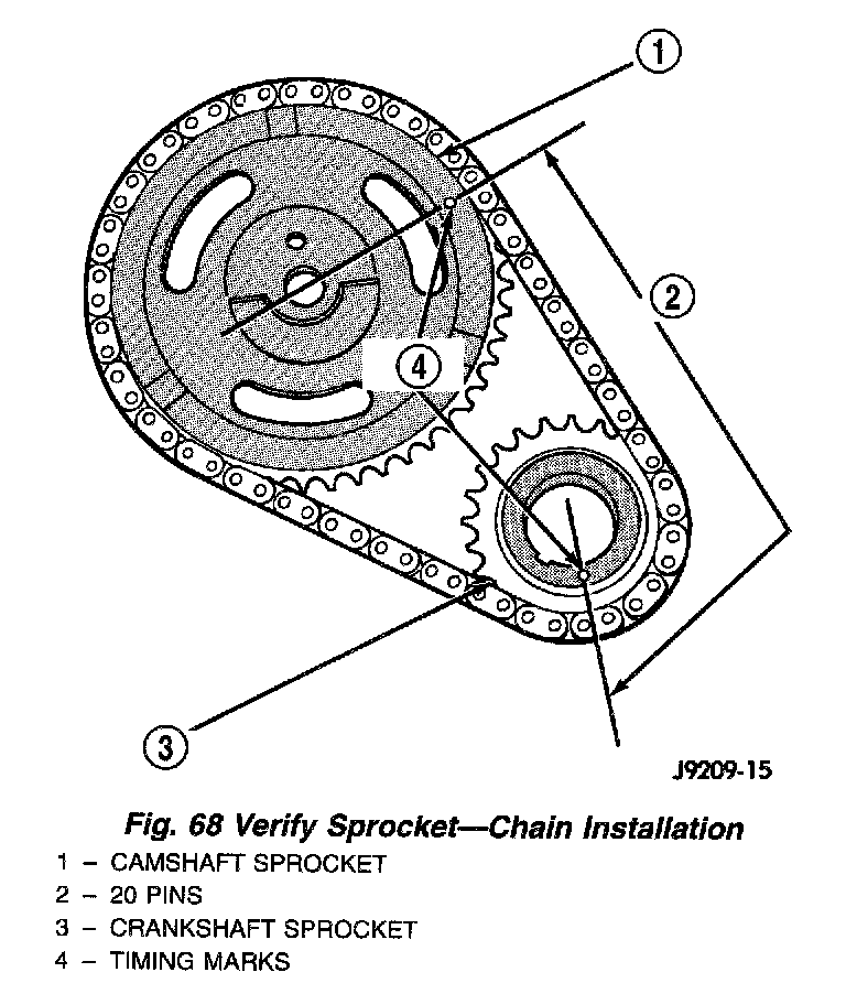 5. To verify correct installation of the timing chain, turn the crankshaft to position the camshaft sprocket timing mark as shown in (Fig. 68). Count the number of chain pins between the timing marks of both sprockets. There must be 20 pins.