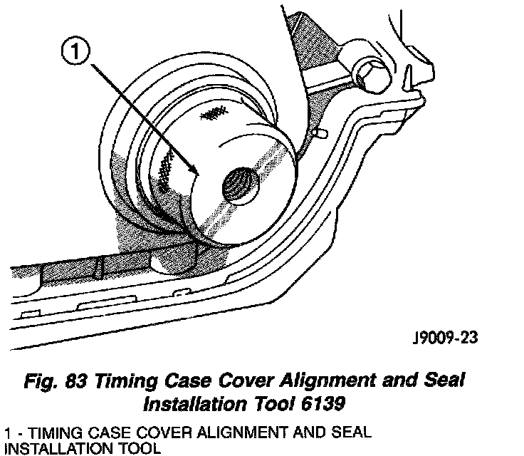 5. Insert Timing Case Cover Alignment and Seal Installation Tool 6139 in the crankshaft opening in the cover (Fig. 83).
