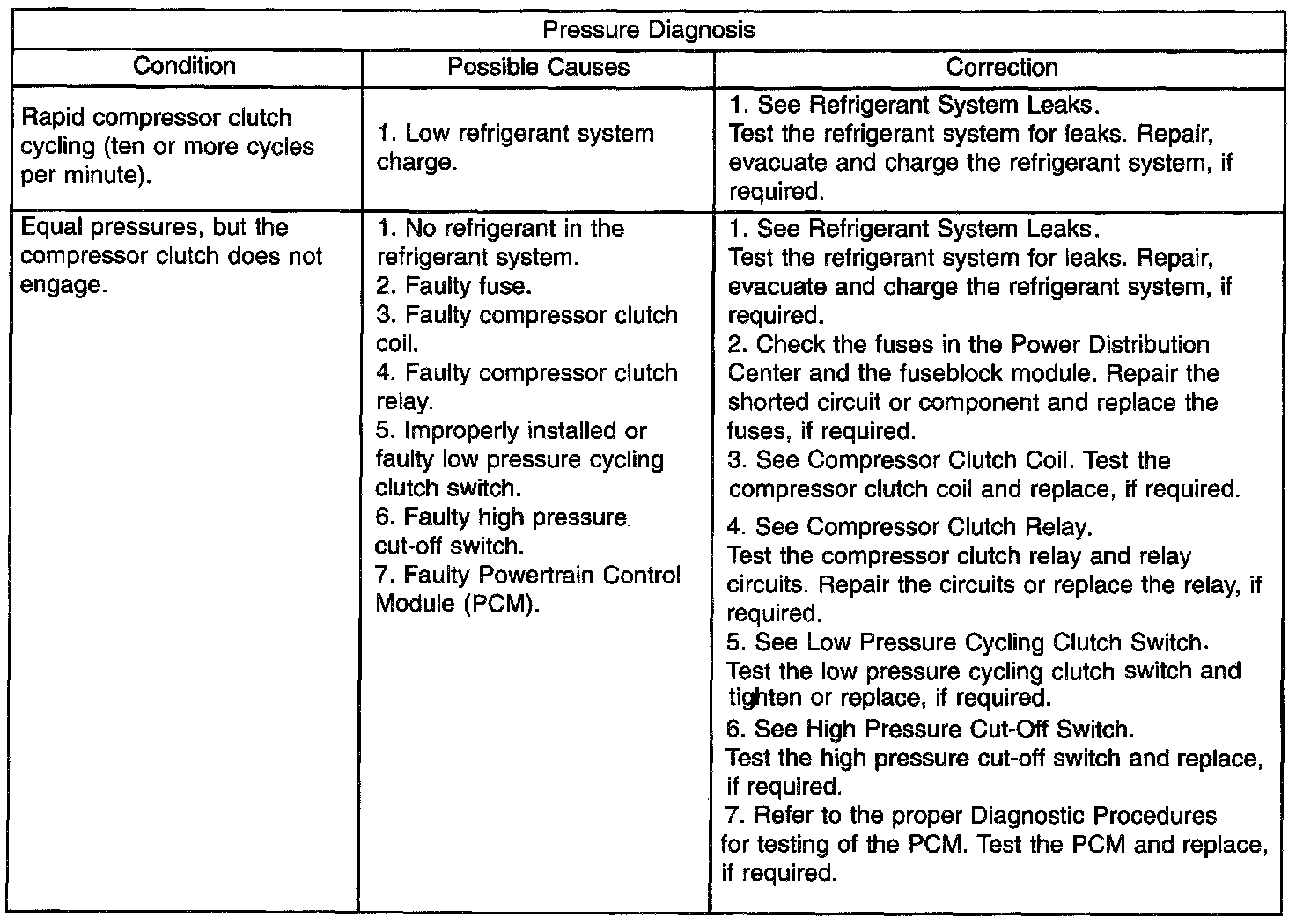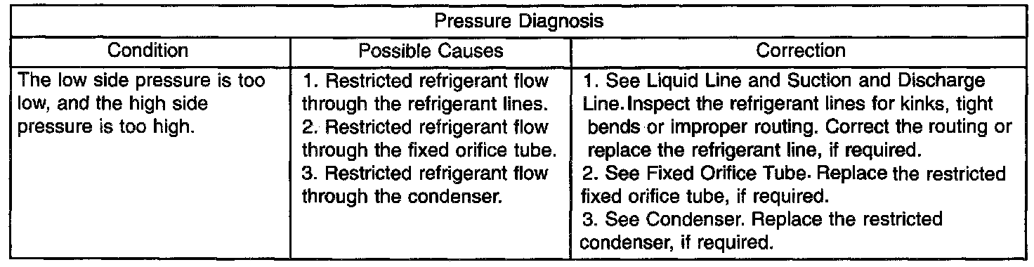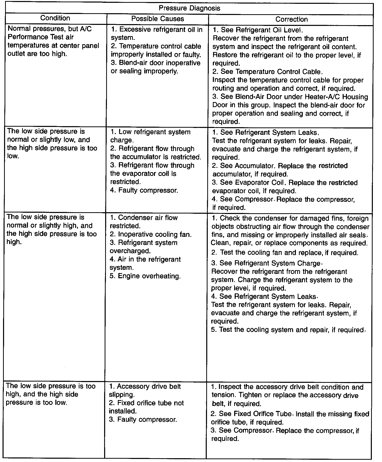 9. Compare the compressor discharge pressure to the compressor discharge pressure is high, see the the Performance Temperature and Pressure chart. If Pressure Diagnosis chart.