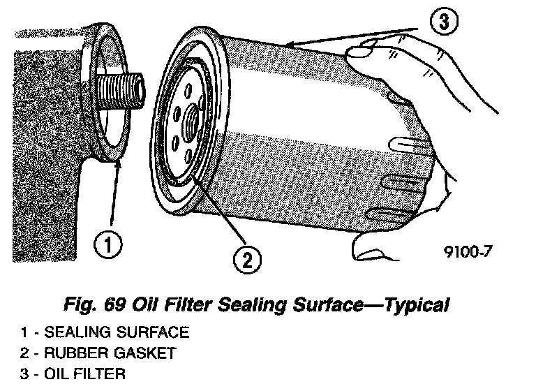 5. Make sure old gasket comes off with oil filter. With a wiping cloth, clean the gasket sealing surface (Fig. 69) of oil and grime.