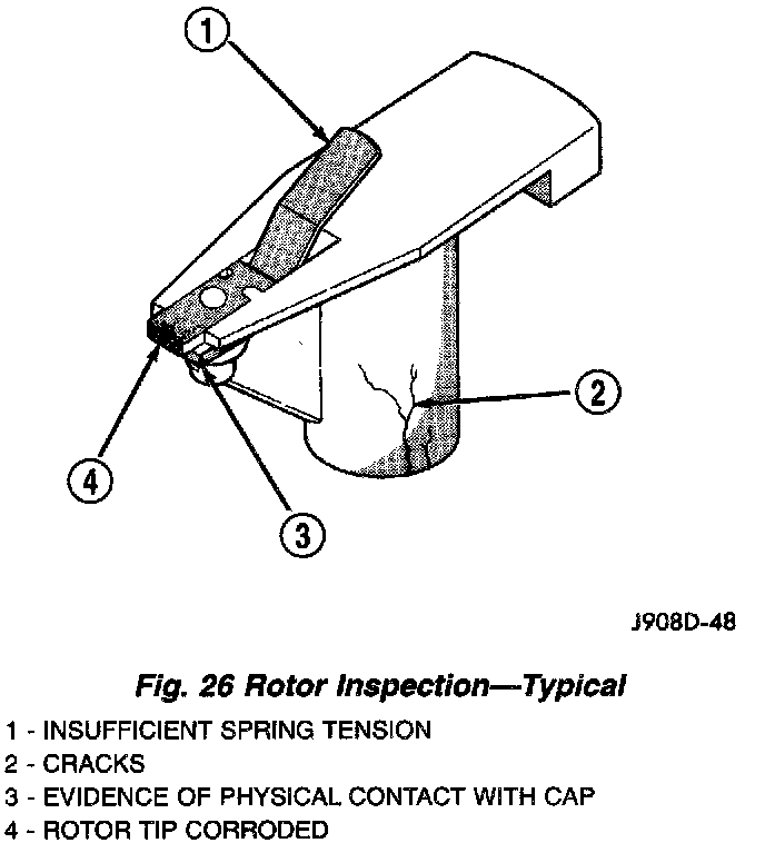 Visually inspect the rotor for cracks, evidence of corrosion or the effects of arcing on the metal tip. Also check for evidence of mechanical interference with the cap. Some charring is normal on the end of the metal tip. The silicone-dielectric-varnish-compound applied to the rotor tip for radio interference noise suppression, will appear charred.