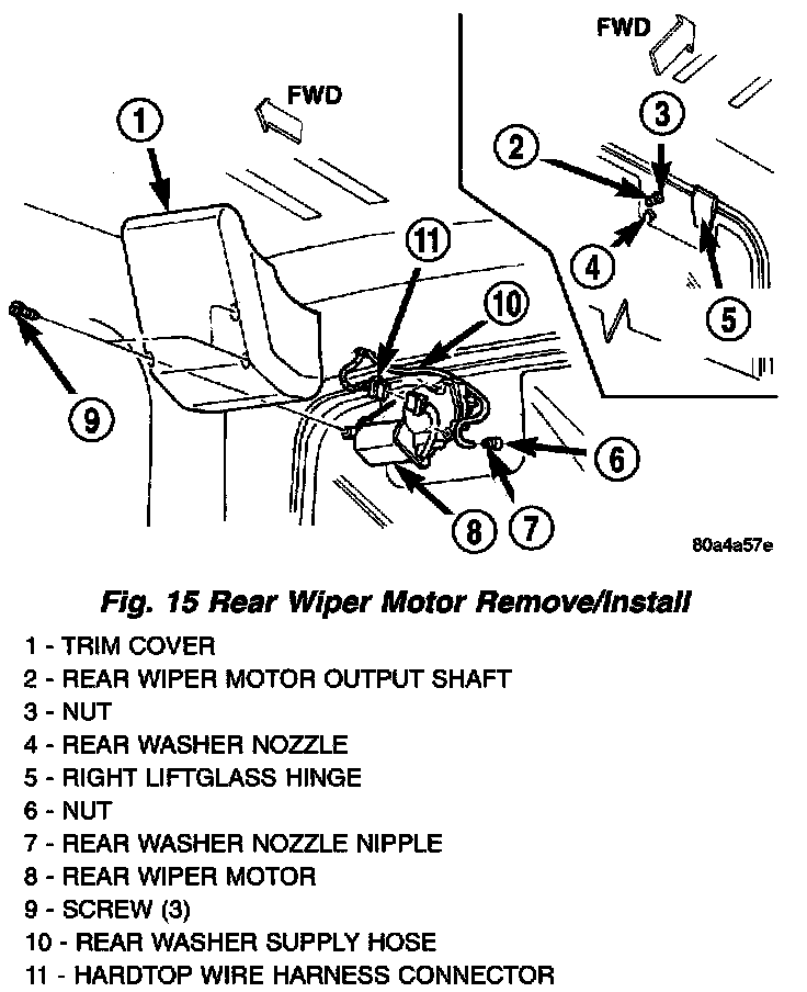 9. From the inside of the liftglass, gently pull the rear wiper motor away from the liftglass until the output shaft clears the hole in the liftglass.