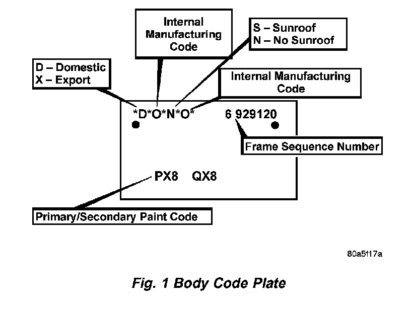 A metal Body Code plate is located in the engine compartment and attached to the top of the right
