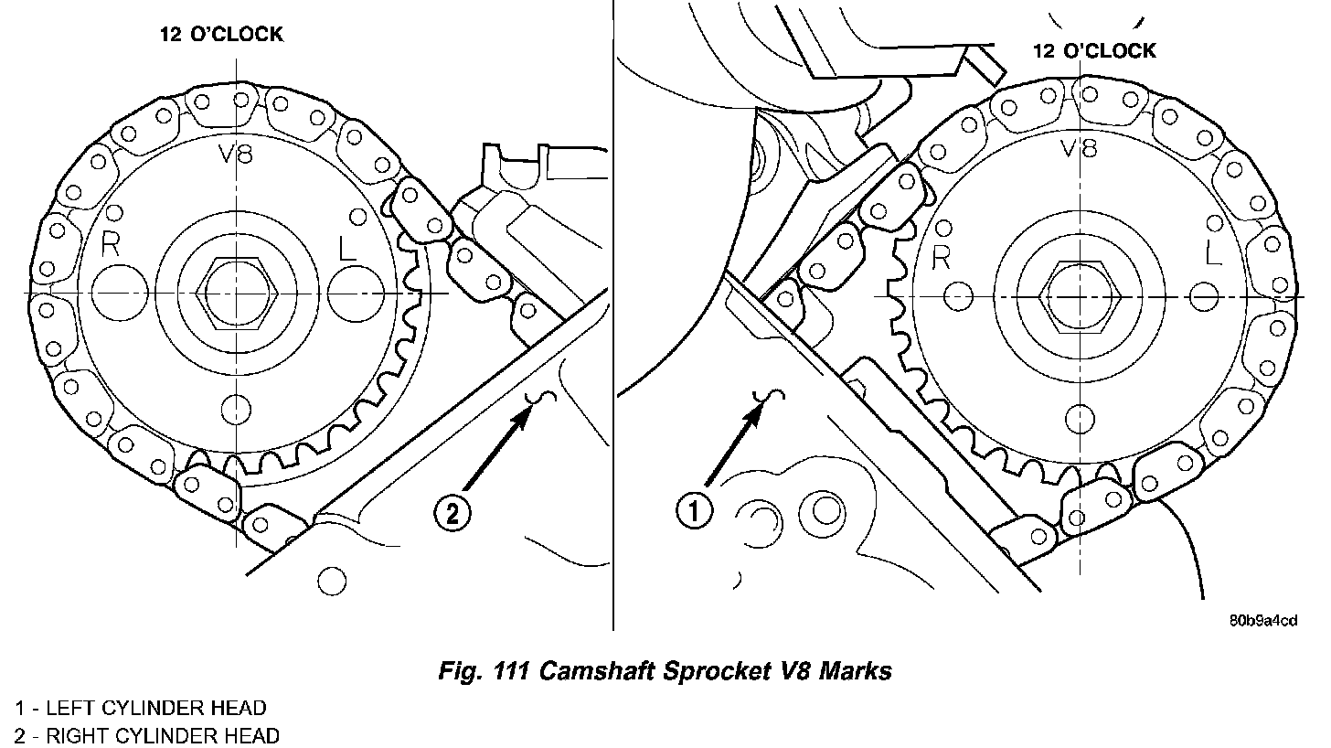 3. Note the location of the V8 mark stamped into the camshaft drive gears (Fig. 111). If the V8 mark on each camshaft drive gear is at the twelve o'clock position, the engine is at TDC (cylinder # 1) on the exhaust stroke. If the V8 mark on each gear is at the six o'clock position, the engine is at TDC (cylinder # 1) on the compression stroke.