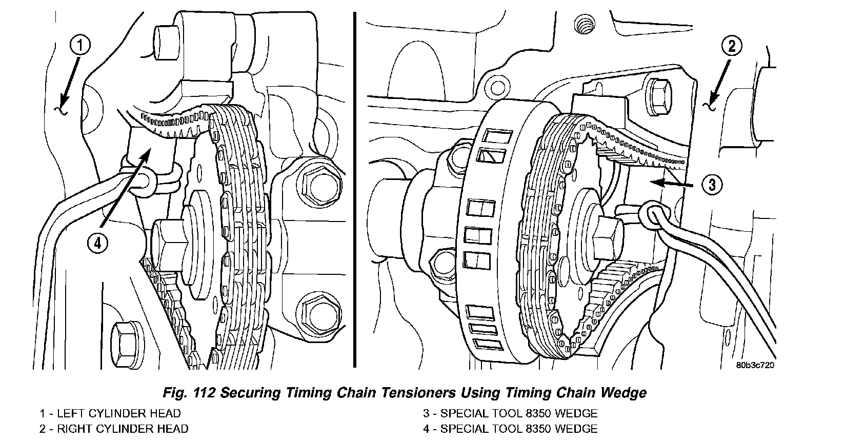 1. Using Chain Tensioner Wedge, special tool 8350, stabilize the secondary chain drive (Fig. 112). For reference purposes, mark the chain-to-sprocket position (Fig. 112).