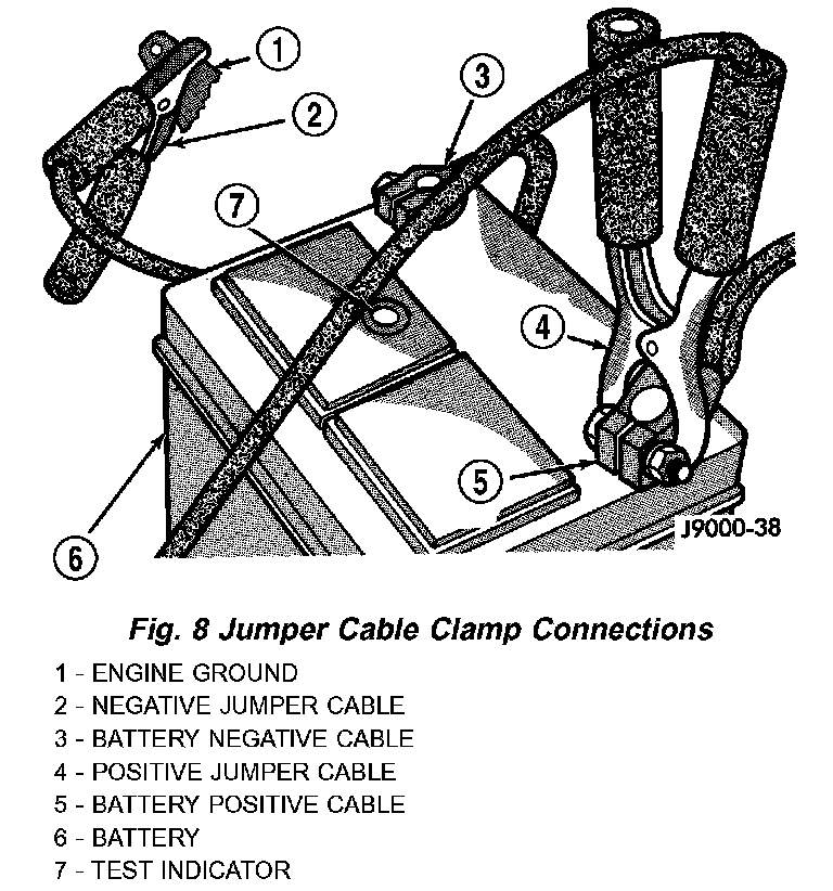 7. Allow battery in disabled vehicle to charge to at least 12.4 volts (75% charge) before attempting to start engine. If engine does not start within 15 seconds, stop cranking engine and allow starter to cool (15 mm.), before cranking again.