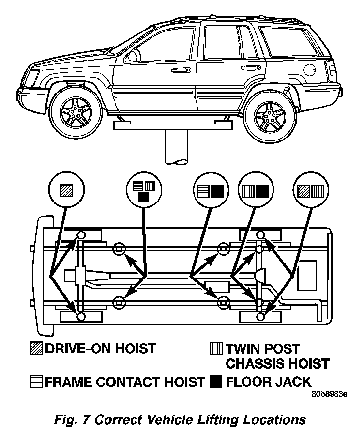 WARNING: THE HOISTING AND JACK LIFTING POINTS PROVIDED ARE FOR A COMPLETE VEHICLE. WHEN A CHASSIS OR DRIVETRAIN COMPONENT IS REMOVED FROM A VEHICLE, THE CENTER OF GRAVITY IS ALTERED MAKING SOME HOISTING CONDITIONS UNSTABLE. PROPERLY SUPPORT OR SECURE VEHICLE TO HOISTING DEVICE WHEN THESE CONDITIONS EXIST.
