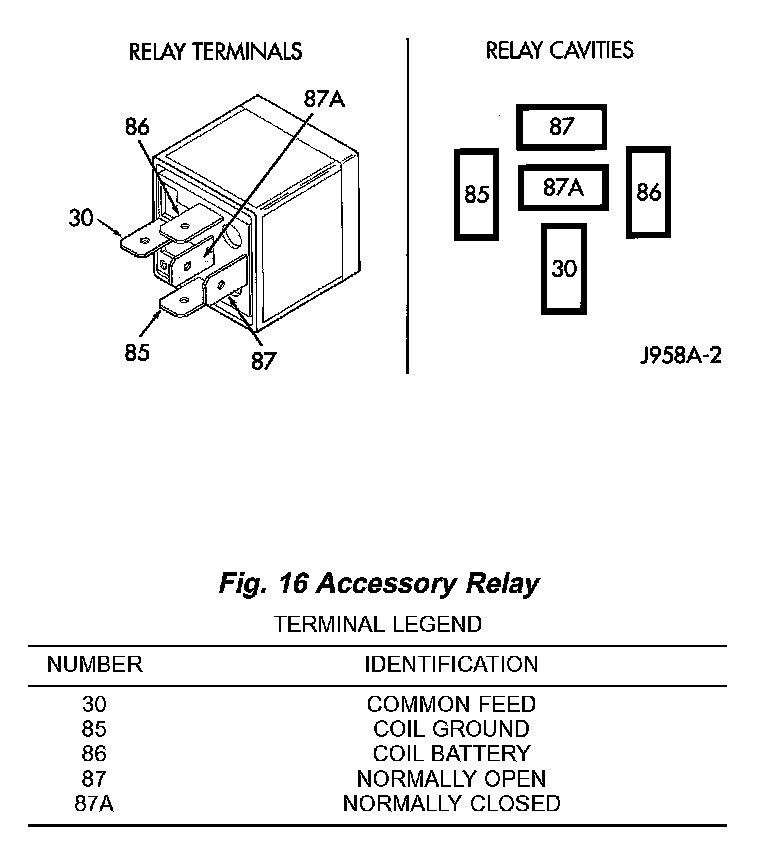 2. A relay in the de-energized position should have continuity between terminals 87A and 30, and no continuity between terminals 87 and 30. If OK, go to Step 3. If not OK, replace the faulty relay.