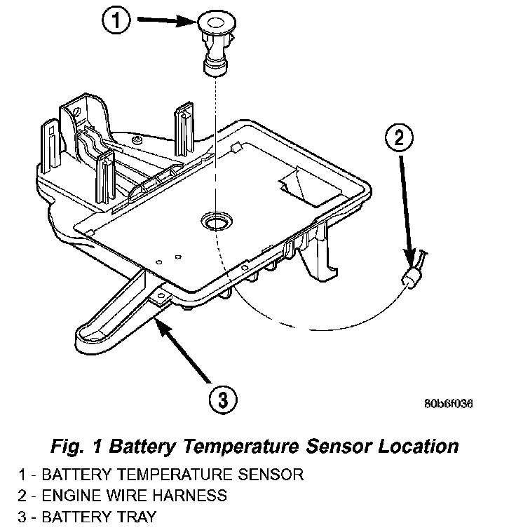 The battery temperature sensor is located under the vehicle battery and is attached to a mounting hole on the battery tray.