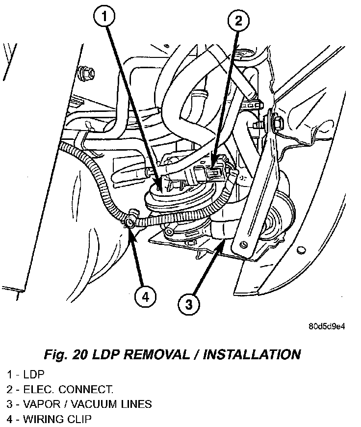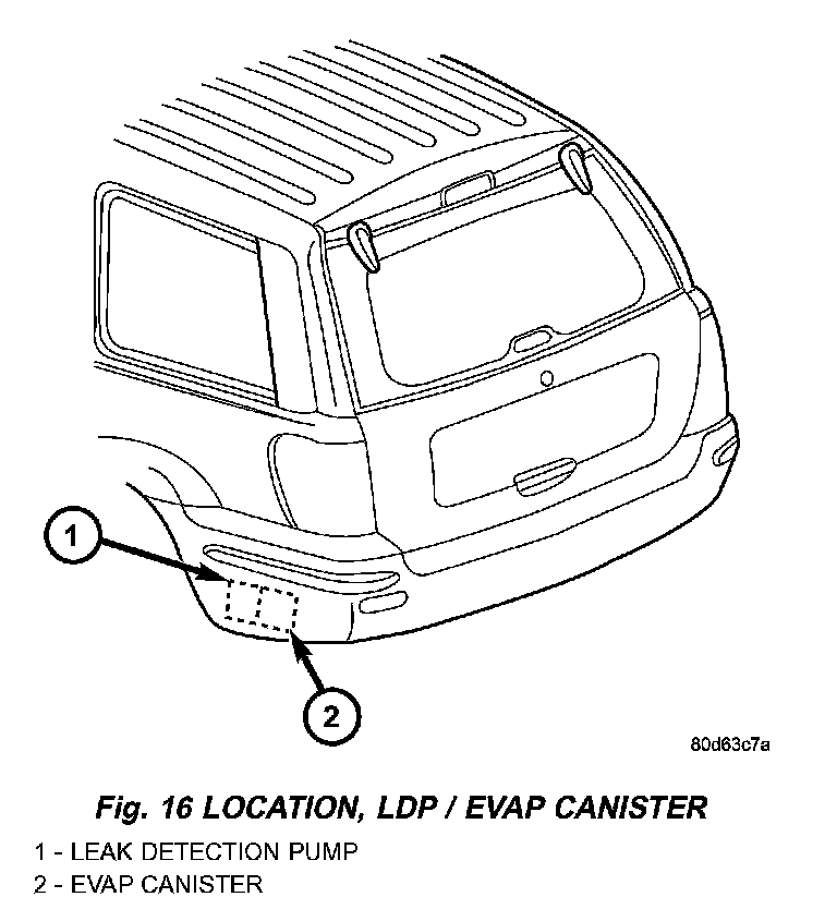 The LDP is located in the left quarter panel behind the left/rear wheel. It is attached to a two-piece support bracket. The LDP and LDP filter are replaced (serviced) as one unit.
