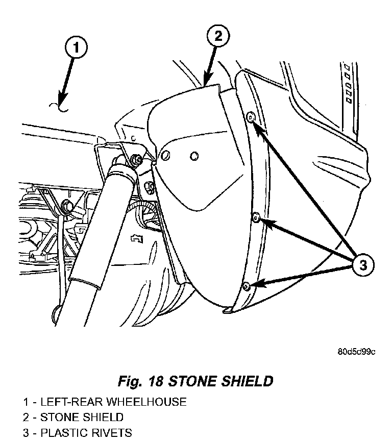 9. Position stone shield behind left/rear wheel. Install new plastic rivets.