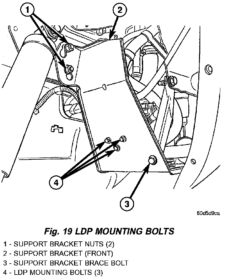 5. To separate and lower front section of two-piece support bracket, remove 3 attaching bolts on bottom of support bracket. While lowering support bracket, disconnect LDP wiring clip.