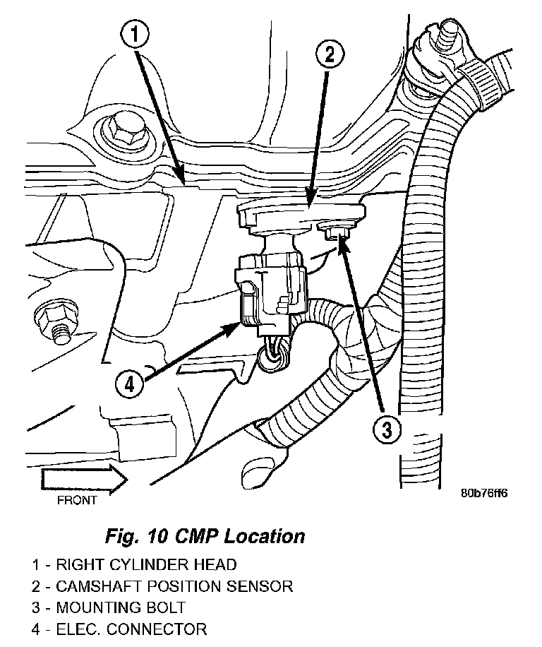 The Camshaft Position Sensor (CMP) on this V-8 engine is bolted to the front/top of the right cylinder head.