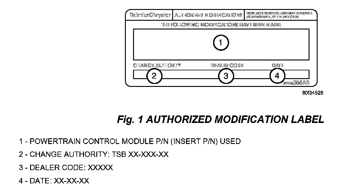 23. Type the necessary information on the "Authorized Modification Label" p/n 04275086AB and attach near the VECI label (Fig. 1).