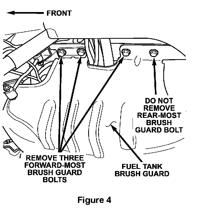 7. Remove the three (3) forward-most LEFT SIDE brush guard/trailer hitch (if equipped) mounting bolts (Figure 4). Do NOT remove the rear left brush guard/trailer hitch mounting bolt.