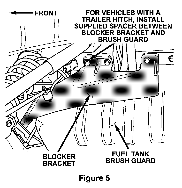14. Position the blocker bracket as far to the right as possible (next to the brush guard) and then install the fuel tank brush guard/trailer hitch mounting bolts (Figure 5). Using a 12 inch extension, tighten the bolts to 65 ft-lbs (88 N.m).