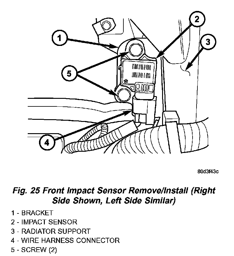 REMOVALThe front and side impact sensors are interchangeable except that the front impact sensors are serviced with a right or left mounting bracket, while the side impact sensors use no mounting bracket. If a front impact sensor is faulty but not damaged, the sensor may be removed from the sensor mounting bracket and replaced with a side impact sensor. If the front impact sensor or the sensor mounting bracket are damaged in any way, or if proper tightening torque of the screws that secure the sensor to the bracket cannot be achieved, the front impact sensor and bracket must be replaced as a unit.