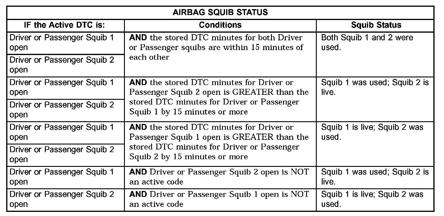 Using the active DTC information, refer to the Airbag Squib Status table to determine the status of both driver and/or passenger airbag squibs.