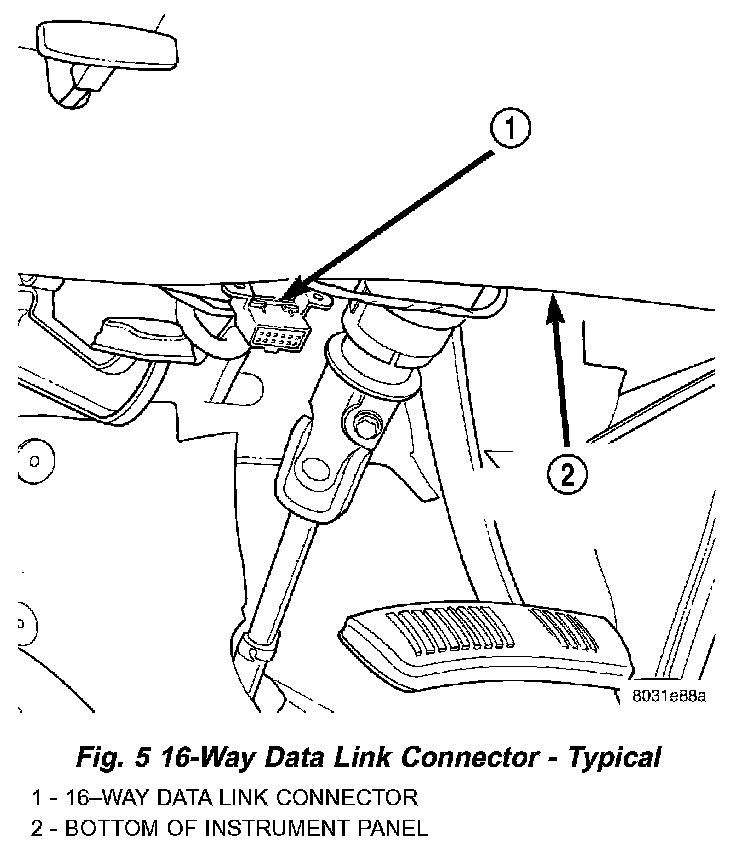 2. Be certain that the DRB III scan tool contains the latest version of the proper DRB III software. Connect the DRB III to the 16-way Data Link Connector (DLC). The DLC is located on the driver side lower edge of the instrument panel, outboard of the steering column.