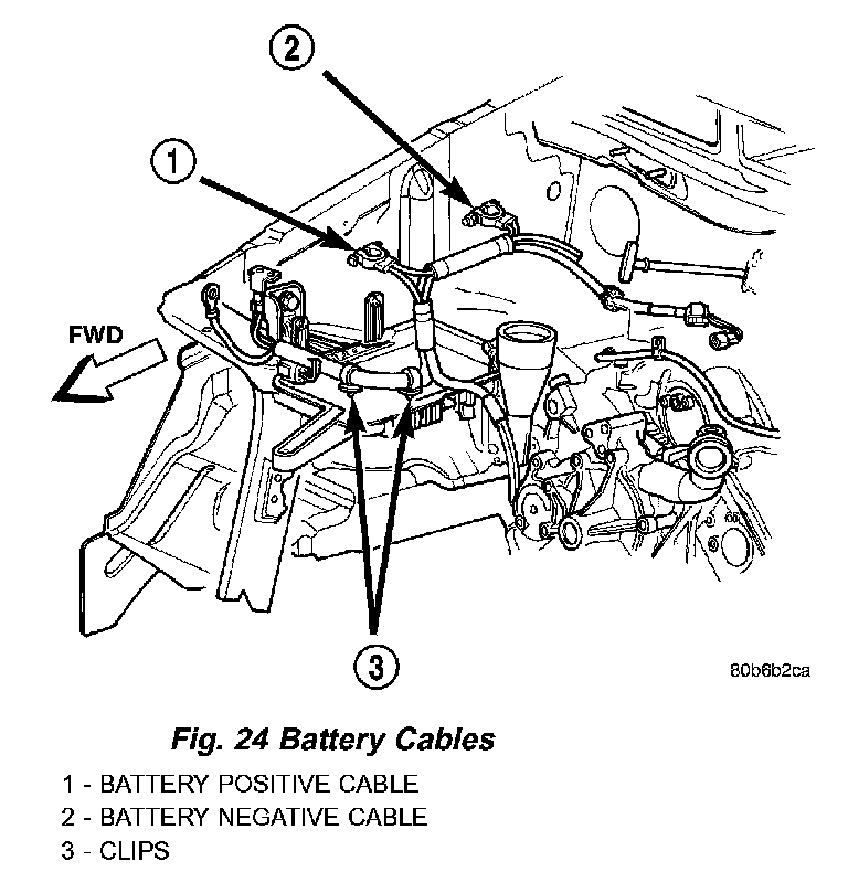 19. Apply a thin coating of petroleum jelly or chassis grease to the exposed surfaces of the battery cable terminal clamps and the battery terminal posts.