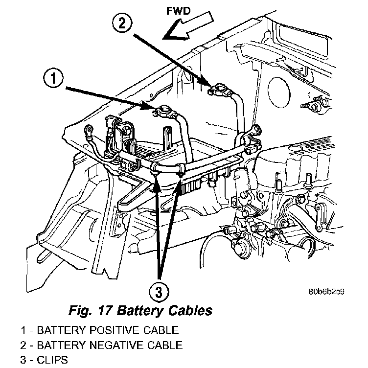 The battery positive cable terminal clamp is die cast onto the ends of two wires. One wire has an eyelet terminal that connects the battery positive cable to the B(+) terminal stud of the Power Distribution Center (PDC), and the other wire has an eyelet terminal that connects the battery positive cable to the B(+) terminal stud of the engine starter motor solenoid. The battery negative cable terminal clamp is also die cast onto the ends of two wires. One wire has an eyelet terminal that connects the battery negative cable to the vehicle powertrain through a stud on the right side of the engine cylinder block. The other wire has an eyelet terminal that connects the battery negative cable to the vehicle body through a ground screw on the right front fender inner shield, near the battery.