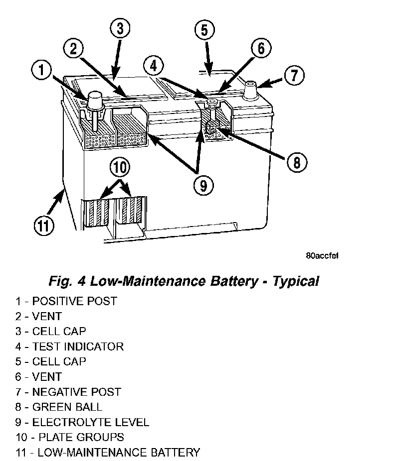 Some factory-installed batteries have a built-in test indicator (hydrometer). The color visible in the sight glass of the indicator will reveal the battery condition. For more information on the use of the built-in test indicator, refer to Standard Procedures The factory-installed low-maintenance battery has removable battery cell caps. Distilled water can be added to this battery. The battery is not sealed and has vent holes in the cell caps. The chemical composition of the metal coated plates within the low-maintenance battery reduces battery gassing and water loss, at normal charge and discharge rates. Therefore, the battery should not require additional water in normal service. If the electrolyte level in this battery does become low, distilled water must be added. However, rapid loss of electrolyte can be caused by an overcharging condition. Be certain to diagnose the charging system after replenishing the water in the battery for a low electrolyte condition and before returning the vehicle to service. Refer to Charging System for additional information.