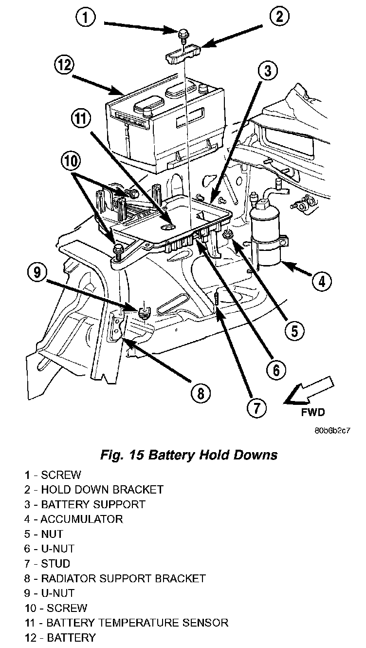 The battery hold down hardware consists of (Fig. 15) a molded plastic lip that is integral to the outboard edge of the battery tray and support unit, a molded plastic hold down bracket, a single hex screw with a coned washer and a U-nut.
