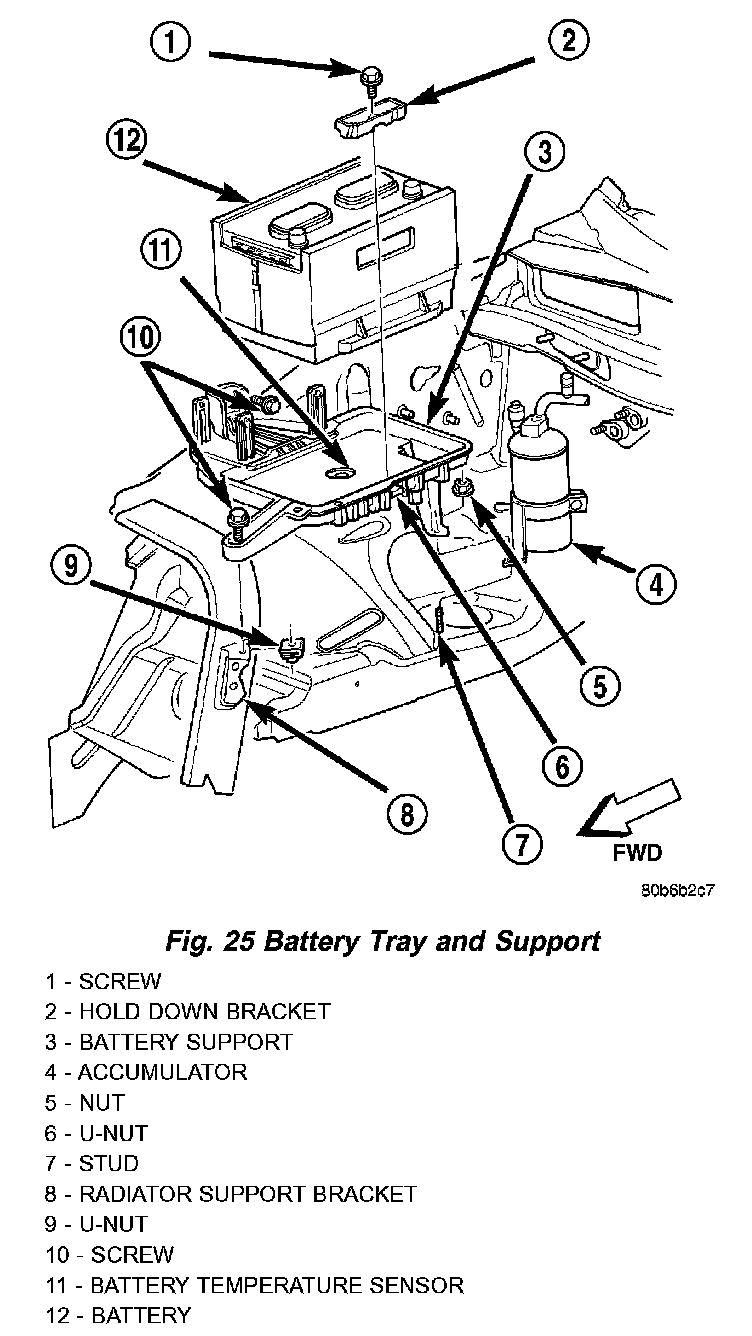 The battery is mounted in a molded plastic battery tray and support unit (Fig. 25) located in the right front corner of the engine compartment. The battery tray and support unit is secured at the rear with a nut to a stud on the front wheelhouse inner panel, at the outboard side with a screw to the side cowl reinforcement panel, and at the front with a screw through a U-nut on a bracket of the radiator support.