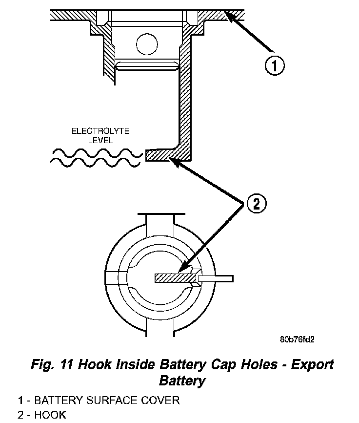2. Look through the battery cap holes to determine the level of the electrolyte in the battery (Fig. 11). The electrolyte should be approximately 1 centimeter above the battery plates or until the hook inside the battery cap holes is covered.