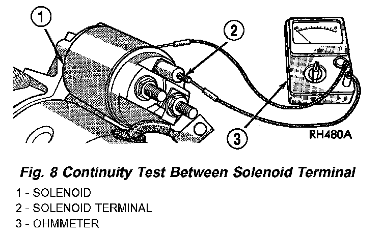 4. Check for continuity between the solenoid terminal and the solenoid case (Fig. 8). There should be continuity. If not OK, replace the faulty starter motor assembly.