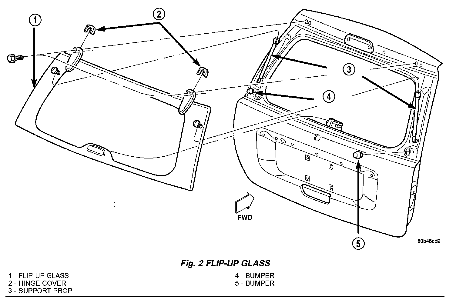 1. Using a trim stick C-4755 or equivalent, separate the glass hinge cover from the hinge on the lift-gate (Fig. 2).