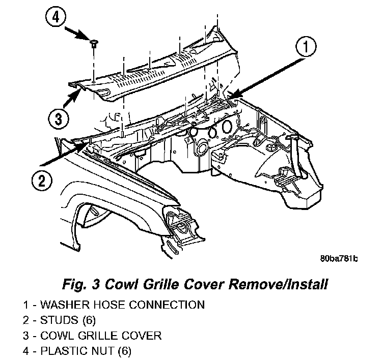 4. Remove the six plastic nuts (2 short and 4 long) that secure the cowl grille cover to the studs on the cowl top panel near the base of the windshield.