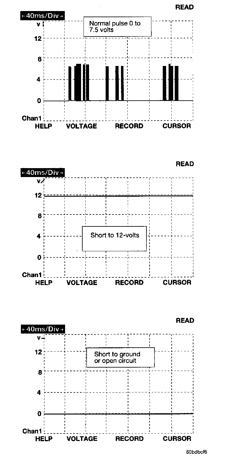 The bus messages are transmitted at a rate averaging 10800 bits per second. Since there is only voltage present when the modules transmit and the message length is only about 500 milliseconds, it is ineffective to try and measure the bus activity with a conventional voltmeter. The preferred method is to use the DRB III lab scope. The 12v square wave selection on the 20-volt scale provides a good view of the bus activity. Voltage on the bus should pulse between zero and about 7-1/2 volts. Refer to the figure for some typical displays.